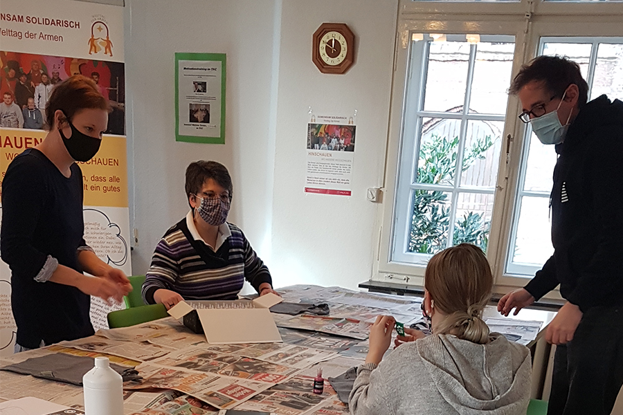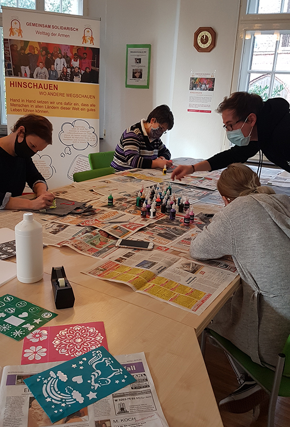 Heute haben wir mit der Gestaltung unserer Beutel begonnen. Unter Corona Bedingungen haben wir gemeinsam mit Schwester Mariotte Hillebrand erste Beutel gestaltet. Zunächst zögerlich („was passiert, wenn ich den Beutel versaue“), dann immer eifriger haben unsere Teilnehmerinnen begonnen, sich kreativ einzubringen. Schablonen wurden genutzt, aber auch frei gestaltet.